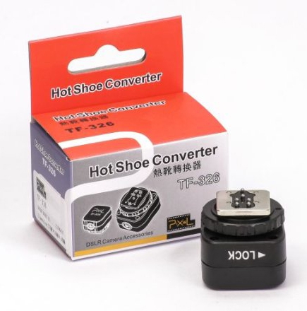 Адаптер на горячий башмак Pixel TF-326 предназначен для подключения вспышек с разъемом PC-Sync к фотоаппаратам Canon. Нет поддержки режима TTL.