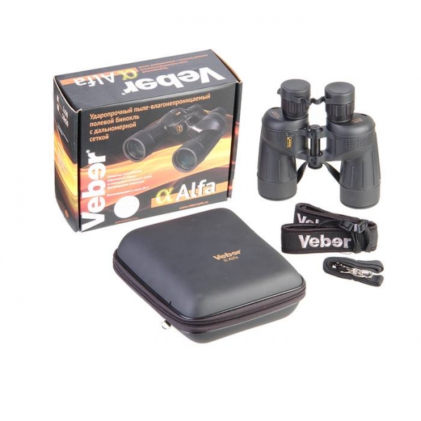 Бинокль имеет обрезиненный литой алюмомагниевый корпус, металлические мосты и оправы окуляров. Благодаря новой конструкции блока Porro-призм (выполнены из оптического стекла BAK-4) ,он имеет не только стандартное противоударное исполнение, но он также стоек и к продолжительным вибрационным воздействиям (к примеру возникающим при передвижении по пересеченной местности на автомобиле). Как у любого профессионального бинокля, у Veber Alfa 7x50 WP раздельная фокусировка окуляров, азотонаполнение и класс защиты от воды JIS-6. Как правило, угломерную шкалу можно использовать только при настройке бинокля «на бесконечность», однако при введении диоптрийной поправки, она выходит из резкости. Особенность оптической схемы бинокля Veber Alfa в том, что шкала установлена точно в фокальной плоскости объектива и она остается в резкости при введении диоптрийной поправки.