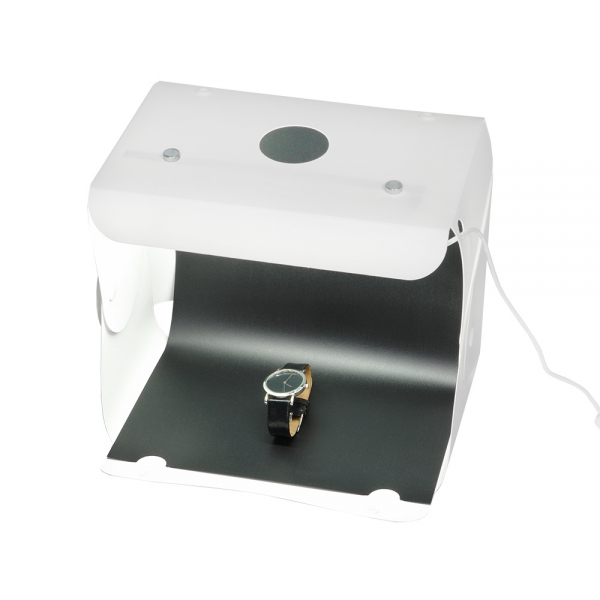 Фотобокс Macro Cube 25 LED является портативной мини-студией и представляет собой белую пластиковую складную конструкцию размером 25x24x22 см и светодиодную ленту на магнитах (15 светодиодов). Фотобокс легко складывается в кейс толщиной 2,5 см, а встроенная ручка делает его удобным для переноски. Перемещая магниты по верхней крышке фотобокса, можно легко отрегулировать положение светодиодной ленты, что позволит выбрать необходимое расположение подсветки без необходимости перемещения объекта съемки. Питание подсветки осуществляется с помощью USB кабеля, подключаемого к зарядному устройству или внешнему аккумулятору PowerBank (зарядное устройство и аккумулятор приобретаются отдельно). В комплект Macro Cube 25 LED входят белый, оранжевый и черный фоны для различных художественных эффектов.