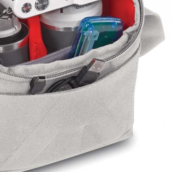 Небольшая плечевая сумка рассчитана на беззеркальные камеры со съемным объективом, дополнительный объектив. Есть небольшие карманы для личных вещей и небольших аксессуаров.
