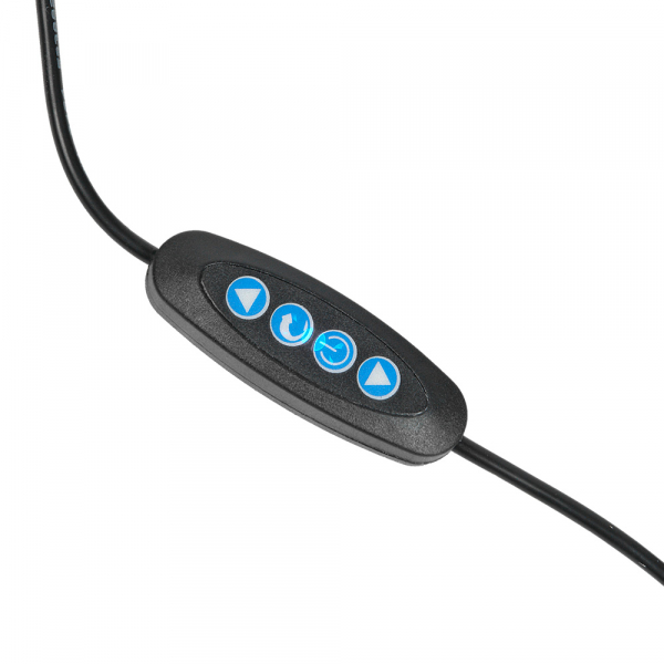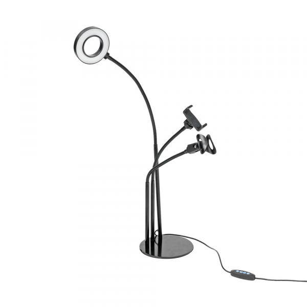 Комплектный бестеневой кольцевой осветитель установлен на гибкую штангу и подключается к любому источнику питания с портом USB. Осветитель снабжен регулировкой яркости (5 ступеней) и цветовой температуры (7 ступеней). Внешний диаметр осветителя — 90 мм. Внутренний диаметр кольца — 48 мм. Количество светодиодов — 24 шт. Высота штанги 58 см.