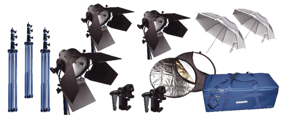 Профессиональное решение для постановки света из 3-х точек. Три универсальных светильника рассеяно-направленного света Logocam D-Spot 1000 в качестве как заливающего, так и рисующего или контрового света. Наличие 2-х отражающих зонтов и набора рефлекторов дает возможность тонкой настройки освещения. Состав комплекта: