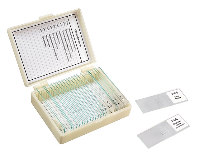 Учебный микропрепарат представляет собой предметное стекло срасположенным изакрепленным нанем объектом, уже подготовленным для исследования под микроскопом. Сверху объект накрыт тонким покровным стеклом. Размеры готовых препаратов стандартные (25мм х76мм) иподходят для использования слюбым биологическим микроскопом Микромед. 9 образцов, 15 предметных стекол, покровные стекла В наборе "Общая Биология" Микромед №2, 9 образцов