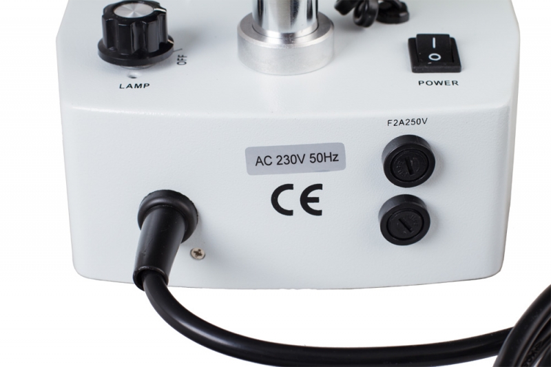 Микроскоп оснащен двумя осветителями, которые могут включаться как одновременно, так и по отдельности. Верхний предназначен для изучения предметов в отраженном свете, а нижний позволяет рассматривать полупрозрачные объекты (например, кристаллы, пластиковые детали и т.д.) в проходящем свете. В осветителях используются мощные галогенные лампы, их яркость может регулироваться, что позволяет подобрать оптимальные условия освещения для каждого объекта. Питание подсветки производится от электросети.