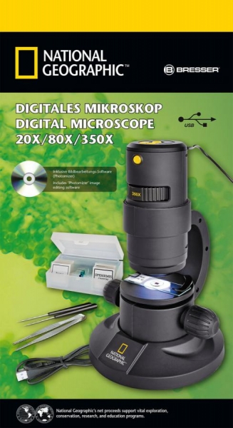 Вес: 1.0 кг. Размер упаковки (ДхШхВ): 28.5×15.5×15.5 см. Микроскоп Bresser National Geographic 20–350x – это цифровой микроскоп начального уровня. Он подойдет детям, школьникам и неискушенным в научных изысканиях взрослым. Управление очень простое, для наблюдений вам понадобится только компьютер или ноутбук. Все, что попадет в поле зрения камеры, будет в режиме реального времени передано на экран. Каждое изображение можно будет сохранить на компьютер или даже записать видео. Микроскоп оснащен удобным колесом регулировки кратности и позволяет выставить одно из трех фиксированных увеличений: 20х. 80х или 350х. Подсветка работает в трех режимах: верхняя (для изучения прозрачных образцов), нижняя (для непрозрачных образцов) или обе сразу (для полупрозрачных образцов). Изучать можно любые предметы окружающего мира: от листьев и домашней пыли до насекомых и минералов. Сняв микроскоп со штатива, вы сможете подобраться к труднодоступным местам препарата или использовать микроскоп как лупу при чтении текста. В комплекте есть все необходимое, чтобы сразу начать исследования: готовые микропрепараты и инструменты для их самостоятельного создания. Программное обеспечение также входит в комплект поставки.
