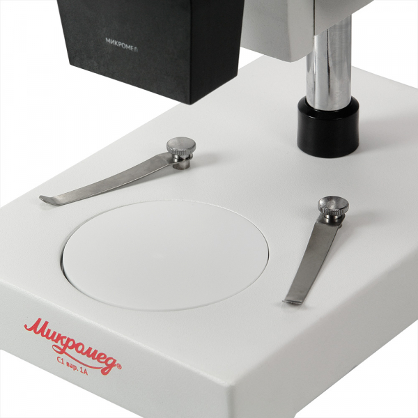 Микроскоп стерео Микромед МС-1 вар. 1А (4х) Стереоскопический микроскоп Микромед МС-1 с увеличением 40х относится к классу инструментальных микроскопов и рекомендован к применению в электронике, для проверки и разборки точных и измерительных инструментов, в обучающих экспериментах, для проведения исследований и точных технологических операций. Микроскоп предназначен для школ, исследовательских институтов, промышленных предприятий и домашнего использования. Микроскоп формирует правильное (неперевернутое) объемное изображение, регулируемое межзрачковое расстояние и диоптрическая коррекция помогут настроить микроскоп под себя. Благодаря большому рабочему расстоянию 60 мм, микроскоп позволяет исследовать объемные объекты, например образцы минеральных камней, монеты, ювелирные изделия. Колесико грубой фокусировки расположено на корпусе и имеет ход 40 мм. Все оптические элементы изготовлены из качественного стекла с высоким коэффициентом пропускания света. Микроскоп не требует покупки батареек или питания от сети, для наблюдений используется естественное освещение. Предметный столик съемный двухцветный, для удобного исследования на контрастном фоне его можно развернуть черной или белой стороной вверх. Клеммы с пружинным механизмом позволяют удобно расположить препарат на предметном столике.