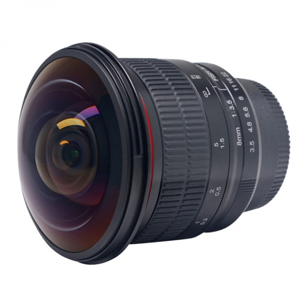 Meike 8mm f/3.5 - сверхширокоугольный объектив с постоянным фокусным расстоянием типа "Рыбий глаз". В комплекте съемная бленда.