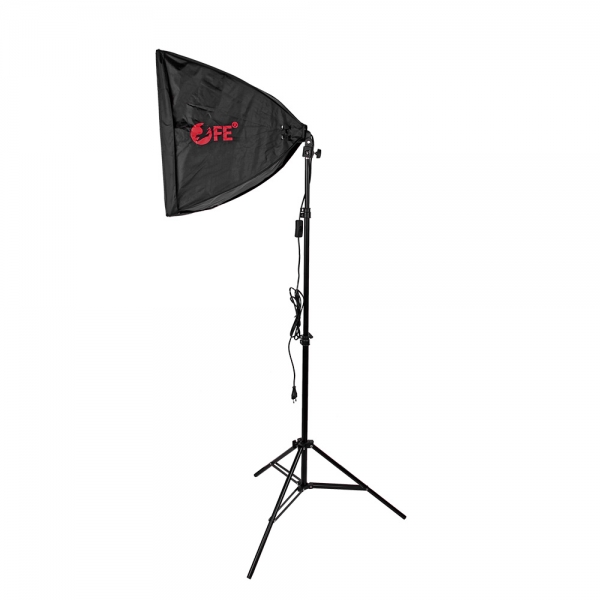 Осветитель оборудован патроном стандарта Е27, в который устанавливаются светодиодная лампа. На электрокабеле находится выключатель. Осветитель питается от сети 220 В и имеет стандартный разъем для установки на стойки с креплением 5/8". Осветитель можно использовать самостоятельно или вместе с софтбоксом 50х50 см из комплекта поставки.