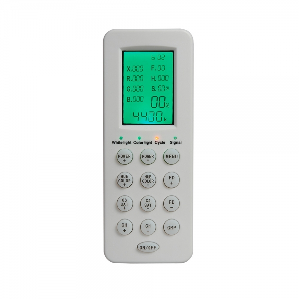 Управление мощностью и цветовой температурой осветителя также можно производить с помощью пульта дистанционного управления с ЖК-дисплеем, который входит в комплект поставки.