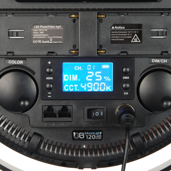 Корпус осветителя изготовлен из ударопрочного ABS пластика, на передней части корпуса расположен белый молочный светорассеиватель диаметром 28 см. На задней части корпуса расположены элементы управления осветителем, LCD экран с подсветкой, разъёмы DMX тип RJ45, разъём питания, разъёмы для установки аккумуляторов и тумблер питания. Протокол DMX-512 позволяет подключать и объединять в группы не только осветители GreenBean MoonLight 120 LED bi-color, но и различные устройства других производителей (прожекторы, осветители и т.д.) к пульту управления (существуют и беспроводные передатчики и приемники для управления по DMX). Сверху на корпусе расположен «холодный» башмак для установки аксессуаров (приобретаются отдельно): например, микрофонов, держателей для смартфонов и т. д. .