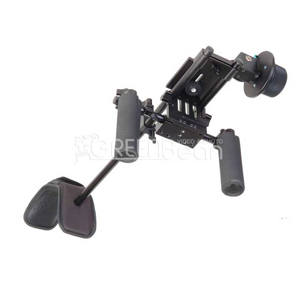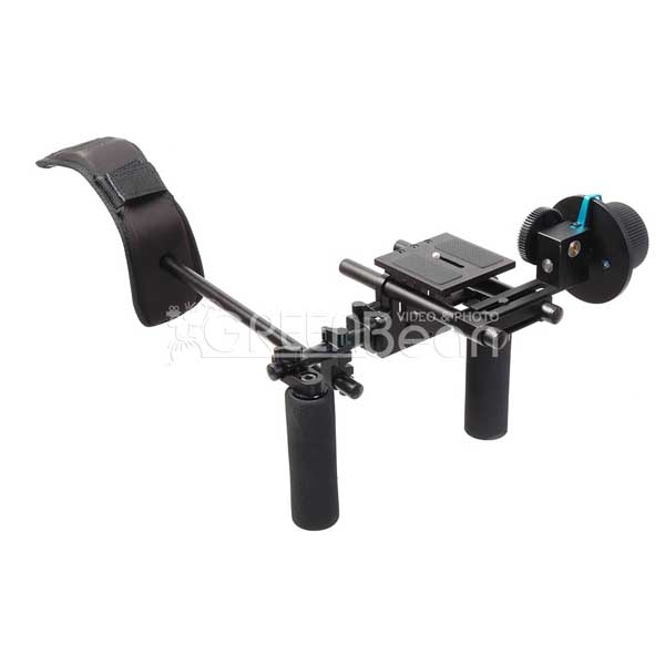 Компактный, легкий и недорогой, но профессионально исполненный плечевой упор для видеосъемки DSLR или HDV камерами. Все его элементы, за исключением поролона ручек, обшивки наплечника и заглушек изготовлены из алюминиевого сплава с высококачественным оксидным покрытием. К направляющей длиной 300 мм (диаметр 16 мм) крепится консоль с двумя рукоятками. Рукоятки металлические длиной 150 мм, обтянуты плотным поролоном. Максимальное расстояние между их осями составляет 230 мм. Угол наклона рукояток и их взаимное положение на консоли можно изменять. Узел площадки камеры также устанавливается на консоли и фиксируется двумя барашками. Возвышение площадки для камеры над консолью составляет 70 мм. Снизу этого узла имеются 6 резьбовых отверстий ¼ дюйма для установки RIG03 на штатив или «апгрейда» держателями дополнительного оборудования.
