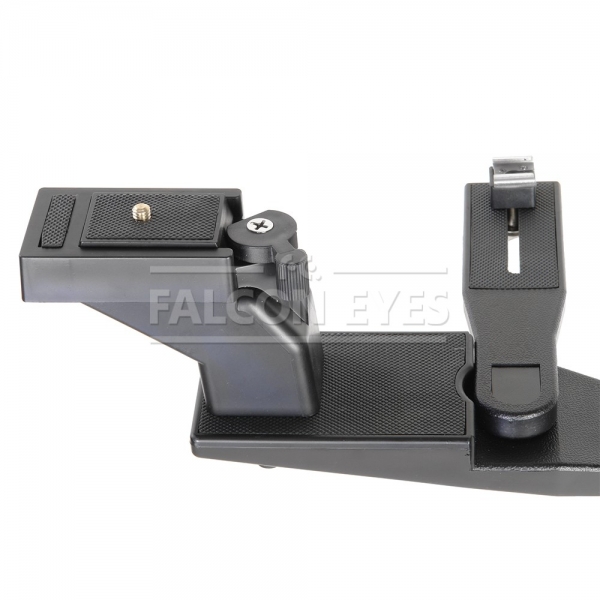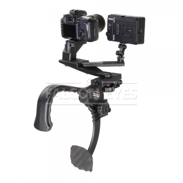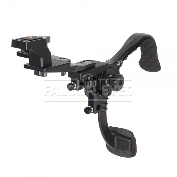 Легкий, компактный (в сложенном положении) наплечный штатив для фото и видеосъемки. Благодаря использованию жесткого и прочного инженерного пластика, металлических осей, в статике он выдерживает нагрузку до 5 кг. Однако, с учетом рывков и толчков, возникающих при съемке в движении, его не рекомендуется использовать с аппаратурой весом более 1,5 кг. Конструкция представляет из себя «коромысло» — задняя часть которого является наплечником с мягкой резиновой вставкой, а передняя — несущей площадкой для крепления подвижного узла с установочным местом для камеры и осветителя (микрофона). Этот подвижный узел может поворачиваться в пределах 180 градусов, а также передвигаться вдоль по несущей площадке «коромысла» в пределах 25 мм. Выбранное положение фиксируется нижним прижимным винтом. К оси «коромысла» закреплен нижний (подвижный, подпружиненный) изогнутый рычаг — для упора в грудь оператора. Его положение фиксируется любым из двух зажимных винтов — слева и справа от оси. В штативе имеются два посадочных места для установки конструкции на стойку с наконечником 5/8 дюйма (с зажимными винтами и бронзовыми вставками). В комплекте — широкий, мягкий ремень с пластиковым карабином.