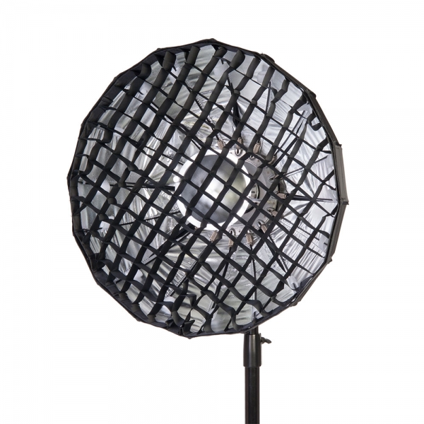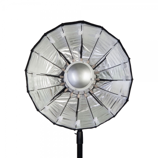 Конструкция тарелки представляет собой основание со специальным механизмом раскладывания спиц и натянутым на каркас тканевым серебристым рефлектором. При раскладывании происходит автоматическая фиксация спицы, а для того чтобы сложить тарелку необходимо лишь отпустить специальный стопор на каждой спице. В комплект входит металлический дефлектор, тканевый внутренний рассеиватель с серебристой вставкой, внешний рассеиватель на липучке и сотовая насадка с ячейками 4х4 см. Тарелка быстро подготавливается к работе, сборка занимает несколько секунд – достаточно просто разложить спицы и установить необходимую насадку. Установленную на приборе тарелку можно поворачивать на 360 градусов, выбранное положение фиксируется винтом на основании с внешней стороны.