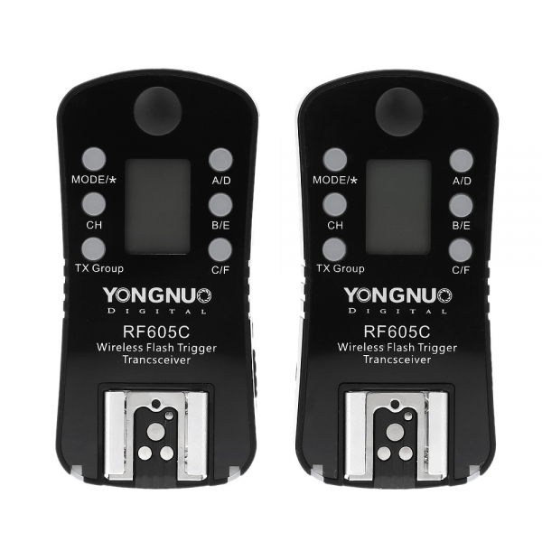 Радиосинхронизатор Yongnuo RF-605C для Canon позволяют запускать накамерные вспышки дистанционно в ручном режиме, с выдержкой до 1/200 - 1/320 сек. Синхронизатор Yongnuo RF-605C выполнен в виде трансивера и может использоваться как приемник, так и передатчик. Наличие 16 каналов в 6 независимых группах позволяют запускать разные вспышки, что очень удобно для постановочной съемки со сложными световыми схемами и для студийной работы. На триггере имеется небольшой LCD экран отображающий текущие установки.
