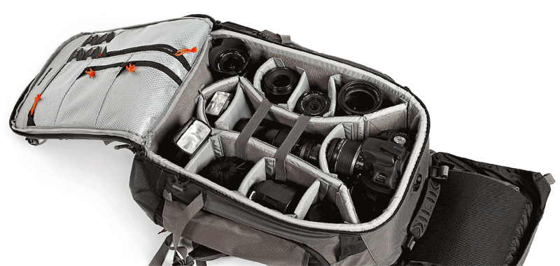 Вмещает: профессиональную цифровую камеру с объективом (до 300 мм f/2,8); 4-5 дополнительных объективов; вспышку; штатив с одной или тремя ножками; аксессуары и личные