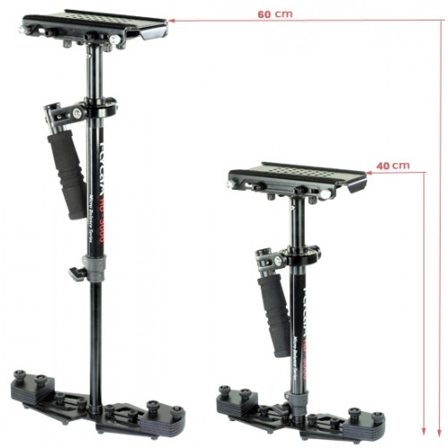 Стойка изготовлена из высокопрочного легкого алюминия. Стойка отличается своей телескопической конструкцией, ее высота регулируется: минимальная составляет 40 см, максимальная – 60 см. Регулировка высоты стойки также помогает при нахождении баланса камеры.