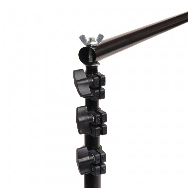 Горизонтальная перекладина — составная. Максимальная длина — 302 см. Состоит из четырёх алюминиевых секций-трубок (Ø 25 мм) с подпружиненными фиксаторами. При необходимости — можно использовать две крайние секции, тогда длина штанги будет составлять 151 см. Установка фона без кармана для крепления производится при помощи зажимов (в комплект не входят).