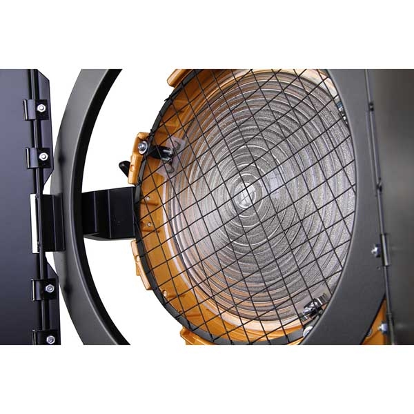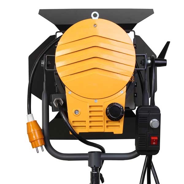 Обеспечивает возможность получения как равномерных потоков заливающего света, так и небольших ярких световых пятен с резкими границами. На расстоянии 2 м от осветителя диаметр светового пятна составляет: минимальный 55 см, максимальный 220 см (ориентировочно). Ручка для перемещения блока «металлический отражатель – лампа» внутри корпуса находится на задней панели прибора и продублирована на передней. Фронтальная линза Френеля изготовлена из стекла и защищена металлической сеткой. Большие металлические шторки на оправе могут поворачиваться на 360 градусов и служат для формирования нужной формы светового пятна. Чтобы их снять следует нажать на подпружиненный шток держателя шторок (находится на корпусе вверху). Корпус осветителя полностью металлический (сталь и алюминиевый сплав), двойной – с воздушным промежутком для эффективного конвекционного охлаждения. Для удобства работы кнопки включения и регулятор мощности смонтированы в блоке на сетевом кабеле. Регулировка мощности от min до max плавная. *Для замены лампы следует «расстегнуть» зажим (находится справа) и повернуть всю фронтальную часть прибора (вместе с линзой и шторками). После этого следует повернуть металлический барашек на цоколе держателя лампы против часовой стрелки. После этого лампу можно вынуть и заменить. Процедура занимает 1 минуту.