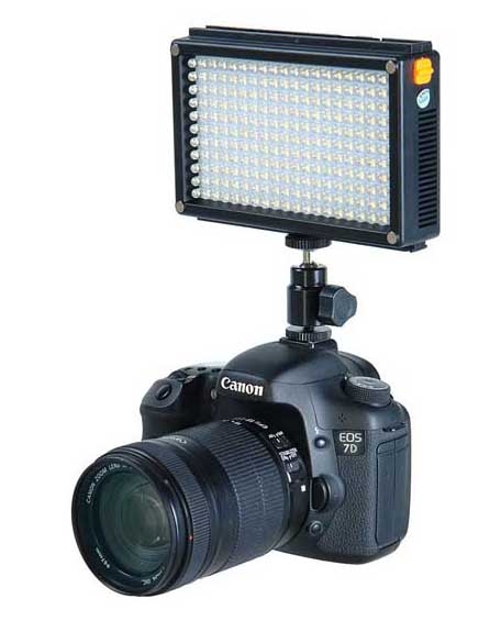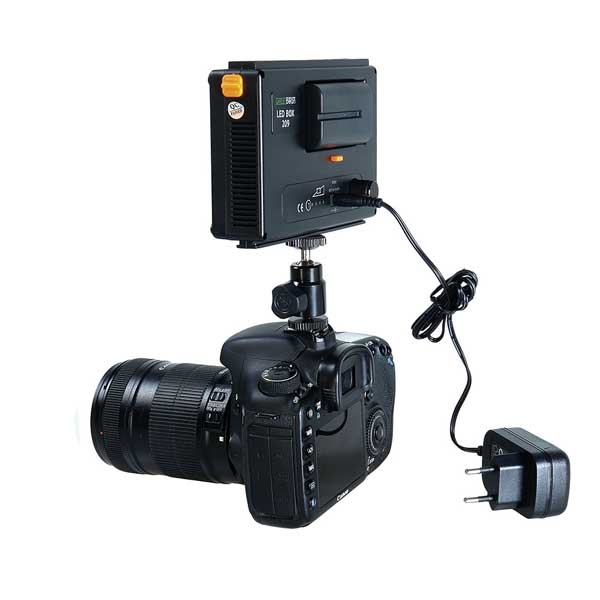 Постоянная яркость сохраняется даже при низком заряде аккумулятора. Цифровой контроллер работающий по методу широтно-импульсной модуляции (многоступенчатое диммирование без мерцания в выбранном положении) позволяет регулировать яркость прибора от 10 до 100%. В комплект входит: аккумулятор емкостью 2200 мАч, зарядное устройство, сетевой адаптер питания, кронштейн с шаровой головкой и посадочными разъемами «башмак» и 1/4", фильтр понижающий цветовую температуру (3200К), матовый рассеивающий фильтр, удобная сумка-чехол с ручкой и жесткими стенками. Емкости аккумулятора хватит примерно на 130 минут автономной работы, на панели управления находится кнопка индикации заряда батареи. Осветитель может работать от сетевого или автомобильного адаптера питания из комплекта.