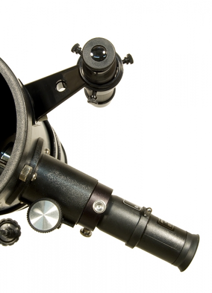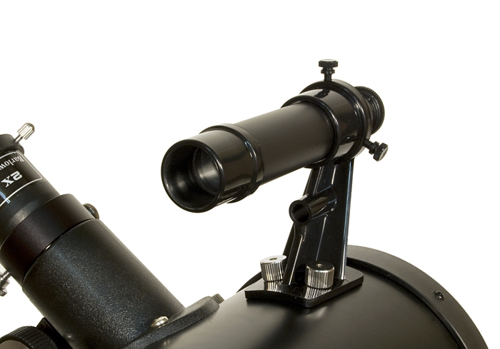 На трубе телескопа установлен оптический искатель, который значительно облегчает наведение телескопа на объекты. Большое поле зрения позволяет быстро найти на небе нужный объект, а перекрестие нитей в окуляре дает возможность точно направить телескоп в нужную точку. Искатель крепится на стойке с кольцом, в котором имеется два регулировочных винта и подпружиненный упор – такая конструкция обеспечивает простоту регулировки и надежное сохранение параллельности оптических осей телескопа и искателя во время наблюдений.