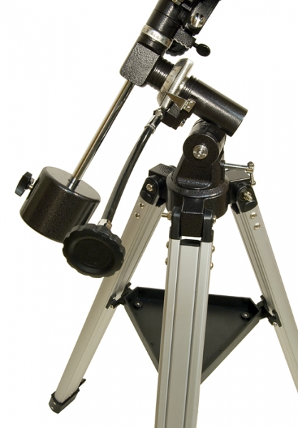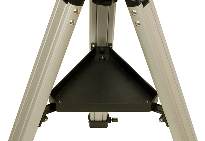 Монтировка телескопа установлена на складном штативе регулируемой высоты. Ноги изготовлены из алюминиевого профиля, благодаря чему штатив отличается небольшим весом при достаточной жесткости. Регулировка высоты позволяет обеспечить комфортные наблюдения для любителя астрономии любого роста – до окуляра сможет достать даже ребенок. Тренога снабжена удобной полочкой для принадлежностей.
