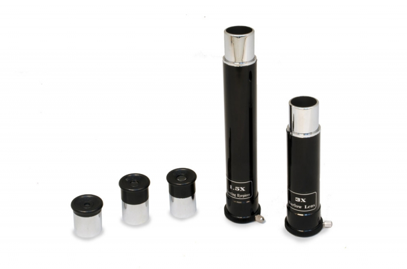В комплект входят 3 окуляра и трехкратная линза Барлоу, позволяющая увеличить фокусное расстояние телескопа в 3 раза! Для обзорных наблюдений лучше использовать окуляр 20 мм (30x). Чтобы изучить объект более подробно, рекомендуется воспользоваться окулярами 12,5 мм (48x) и 4 мм (150x). Оборачивающий окуляр 1,5x необходим для наземных наблюдений: он дает неперевернутое и не зеркальное изображение. Азимутальная монтировка очень проста в управлении. С ее помощью пользователь может перемещать трубу телескопа по высоте и азимуту. Алюминиевая тренога обеспечивает устойчивое положение конструкции. Удобный лоток позволяет держать все необходимые аксессуары под рукой.
