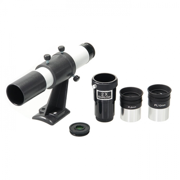 Модель для серьезных, но начинающих любителей астрономии. Зеркало диаметром 114 мм достаточно велико, чтобы собирать много света (в этот телескоп вы сможете увидеть объекты солнечной системы во всех подробностях — таких как щель Кассини в кольце Сатурна, лунные кратеры размером 5 км, неяркие звезды до 13 m звездной величины). Габариты прибора довольно внушительные, длина трубы 86 см. Очень стильное исполнение телескопа: белая глянцевая металлическая труба в обрамлении выглядящих брутально крышек, колец и деталей монтировки, покрашенных фактурной порошковой эмалью, как это принято делать у профессиональных оптических приборов. Удобный искатель (увеличение 6х) расположен рядом с окуляром.