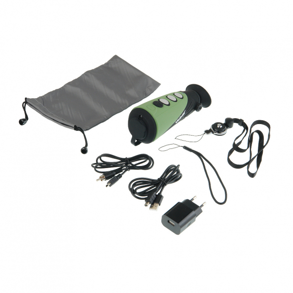Тепловизионный монокуляр Veber Night Eagle M19/384 Тепловизионный монокуляр Veber Night Eagle M19/384 используется охотниками, натуралистами, спасателями для обнаружения объектов и наблюдения за ними ночью и днем в условиях плохой видимости, в любое время года. В отличие от приборов ночного видения на базе ЭОП, тепловизионный прибор не нуждается во внешней подсветке. Качественное изображение даже при наблюдении за движущимися объектами обеспечивает ключевой элемент монокуляра – неохлаждаемая микроболометрическая матрица на основе оксида ванадия, имеющая разрешение 384х288 пикселей (размер пикселя 17 мкм) и частоту обновления изображения 50 Гц. Высокую разрешающую способность прибора гарантирует температурная чувствительность матрицы (<50 мК), позволяющая распознать минимальные перепады температуры на обследуемом участке. Палитру изображения можно выбратьв соответствии с задачами. Предусмотрены режимы горячего белого (объект с максимальной температурой отображается в ярком белом цвете), горячего черного, черно-белого с выделением самых горячих областей красным и цветной. Энергоэффективный прибор способен до 7 часов работать автономно от встроенного литий-ионного аккумулятора. Первоначально в рабочее состояние – от включения до готовности к наблюдению – монокуляр приходит за 20 с. После этого коротким нажатием кнопки питания прибор можно переводить в режим ожидания, продлевая тем самым время автономной работы, и быстро включать в нужный момент. Индивидуальная подстройка изображения под особенности зрения – диоптрийная коррекция – выполняется с помощью барабанчика на окуляре. Для комфортной и продуктивной работы с прибором предусмотрен мягкий эргономичный наглазник, светодиодный фонарь для подсветки, площадка для установки на штатив с резьбой 1/4“, видеовыход для вывода аналогового изображения на монитор. Корпус монокуляра c покрытием soft touch – матовый, теплый и бархатистый на ощупь. От воздействия влаги и пыли кнопки защищены резиновыми накладками, а разъем для питания/видеовыхода – заглушкой.