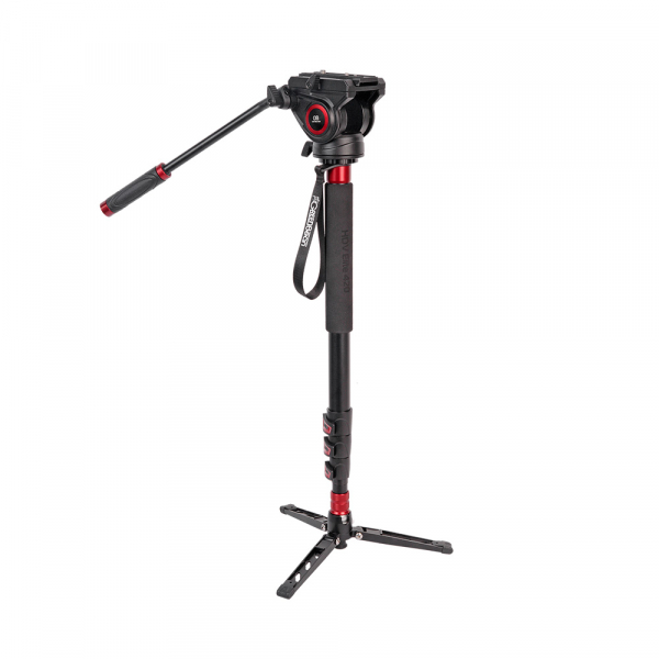 Откидные ножки монопода могут принимать три положения: 1) ножки сложены 2) ножки разложены в максимально широкое положение для максимальной устойчивости 3) ножки разложены в максимально «высокое» положение. Максимально высокое положение ножек может пригодиться в тех случаях, когда для съёмки с разложенным моноподом не хватает буквально ещё нескольких сантиметров высоты; опору( в этом положении ножек) можно использовать и как настольный штатив с несъёмной шаровой головкой. Откидные ножки монопода изготовлены из цельного куска алюминиевого сплава и снабжены фиксаторами и резиновыми накладками. На нижней части шарнира предусмотрена пятка со съёмным резиновым наконечником, которые служат опорой при использовании монопода со сложенными ножками.