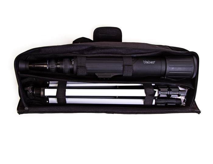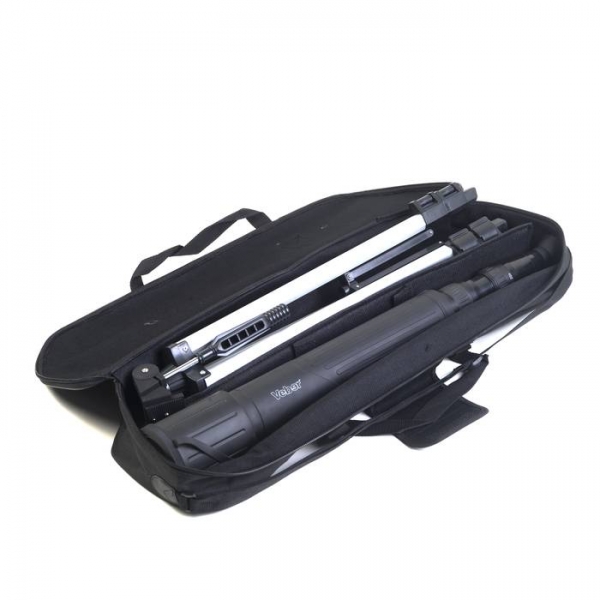 В комплекте - сумка для переноски с наплечным ремнем и ручками. Штатив и труба внутри разделены между собой поролоновой прокладкой. Инструкция на русском языке, гарантийный талон.